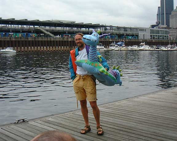 Loulou, mascotte de la Société des Gens de Baignade, et son maître.